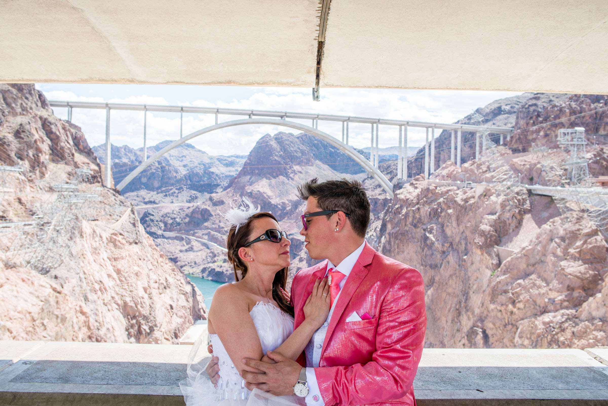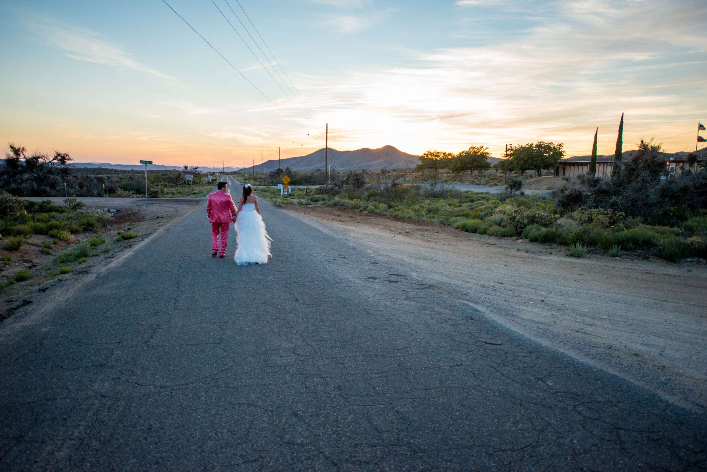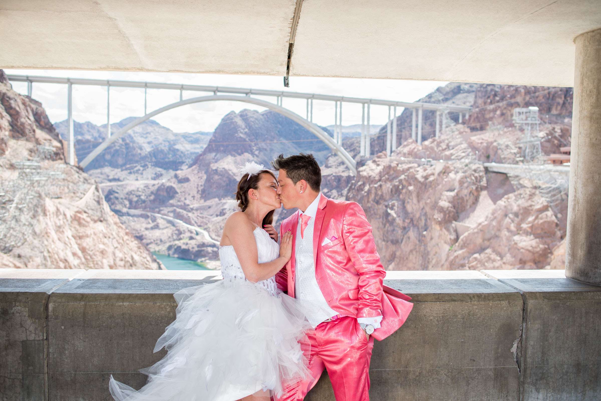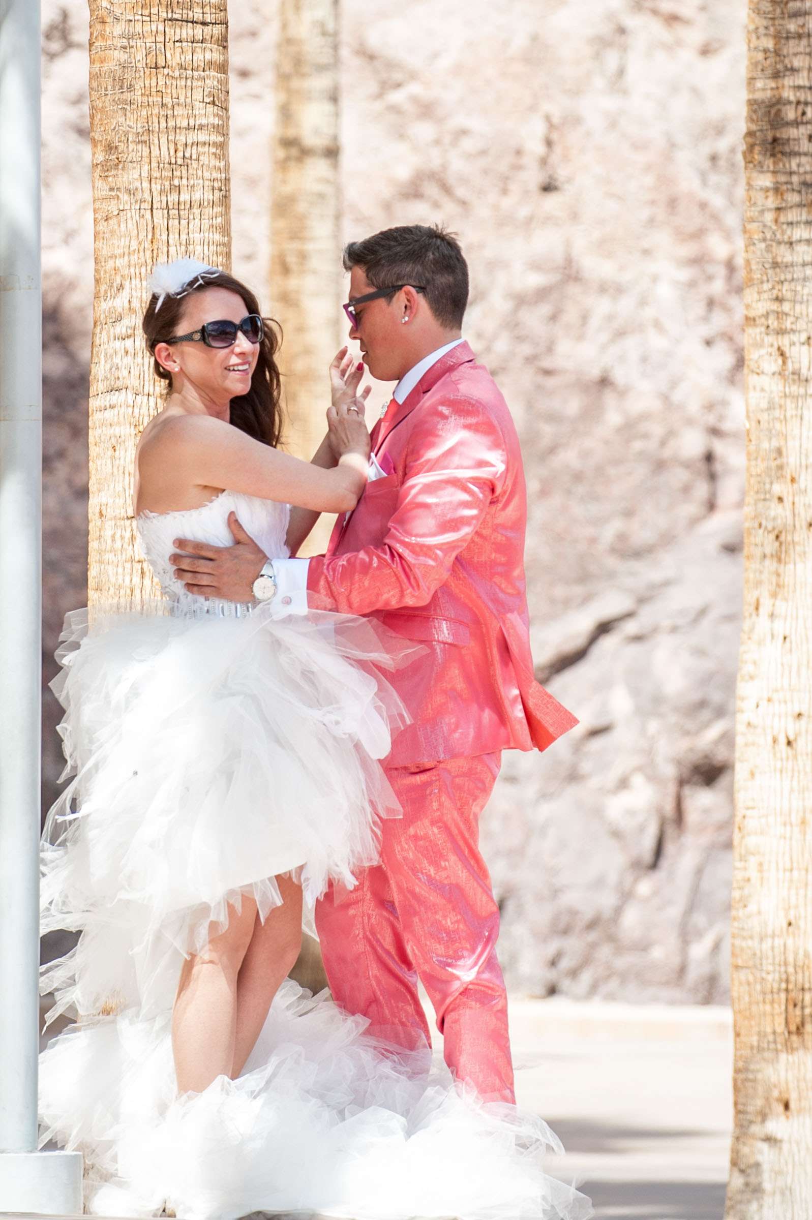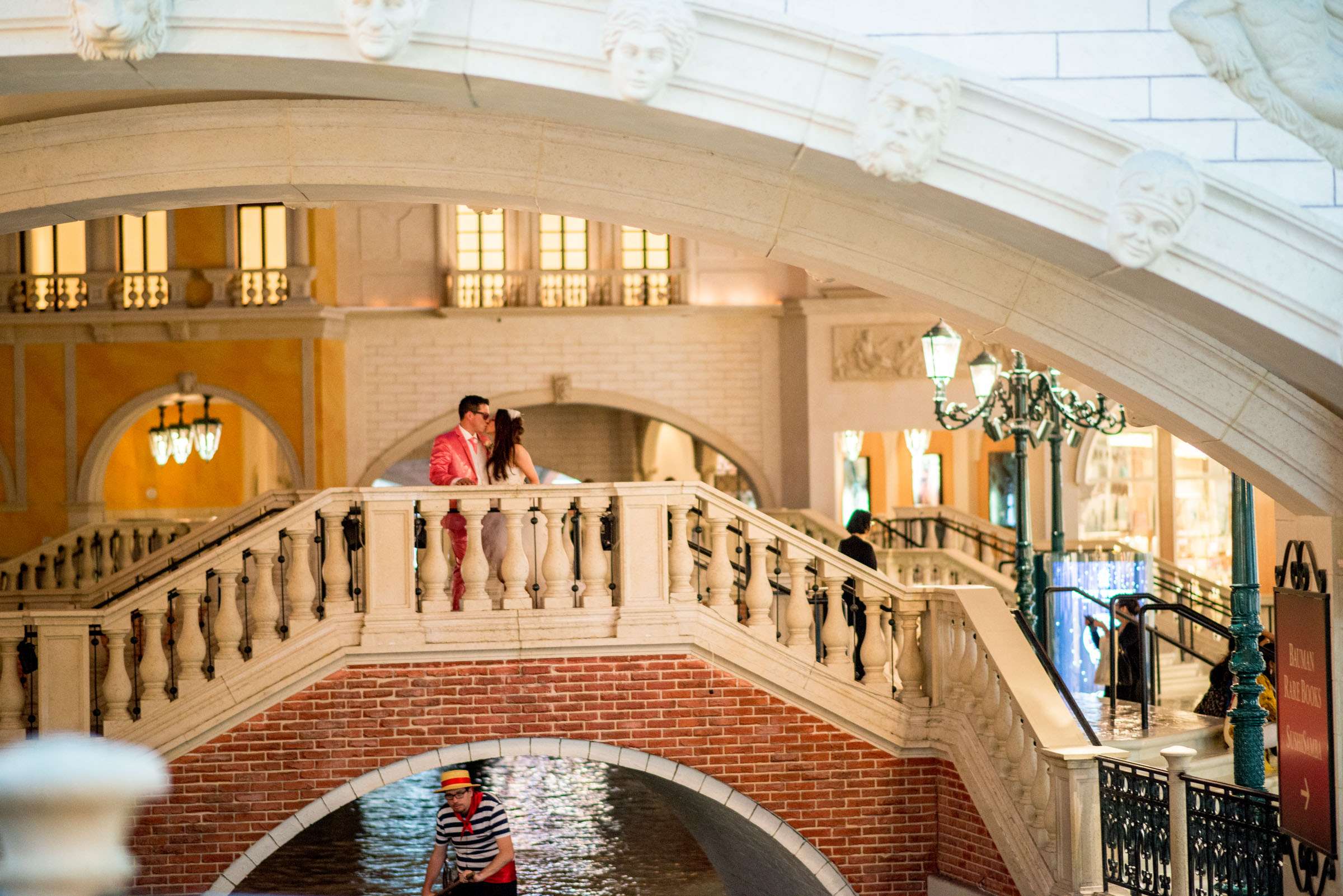 • Hochzeitspaare posieren vor Las Vegas Schild nachts.