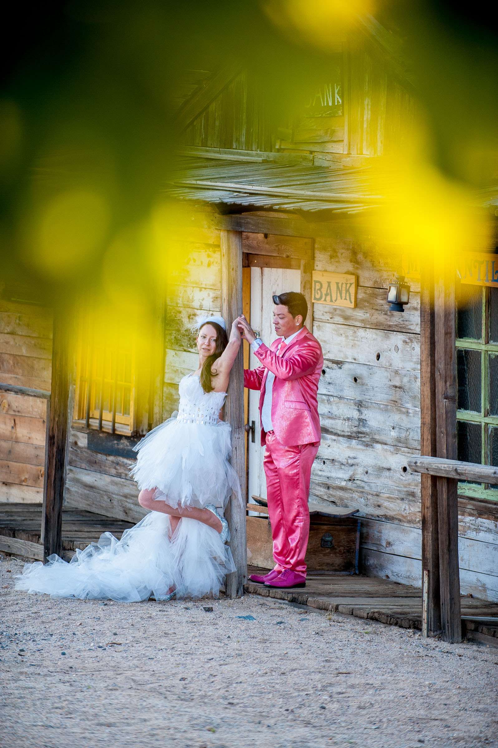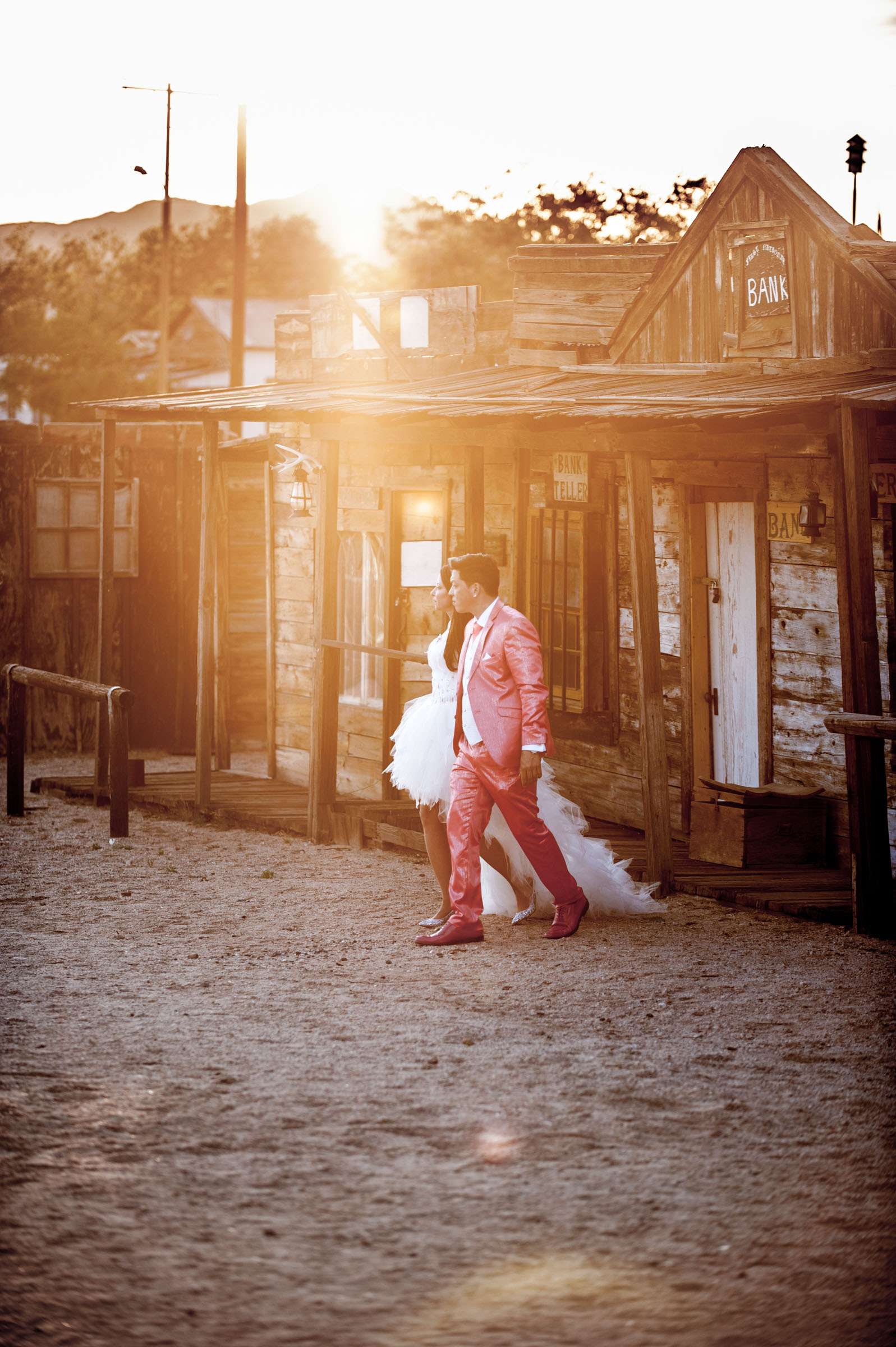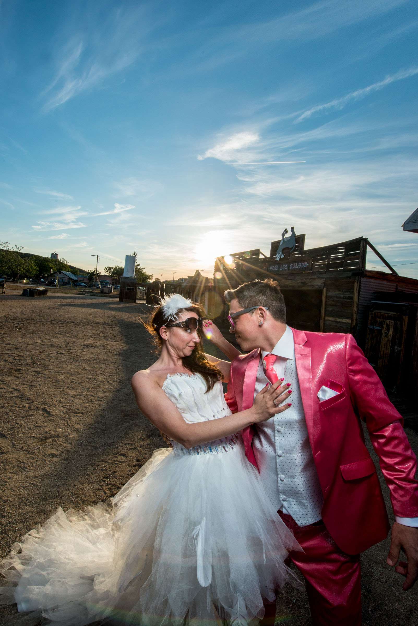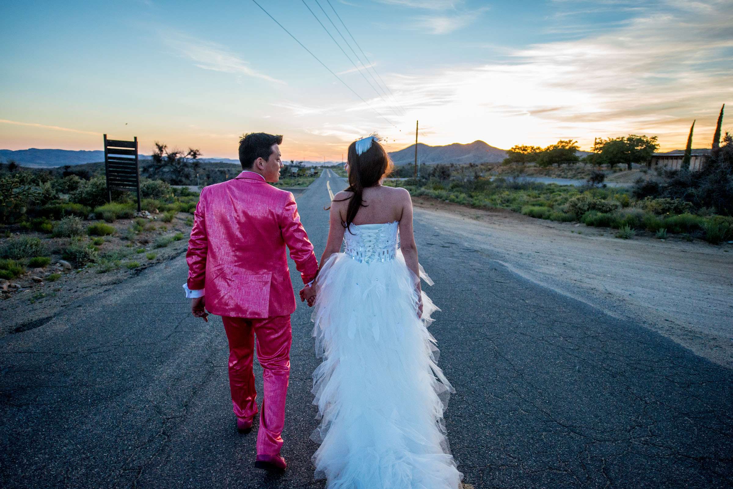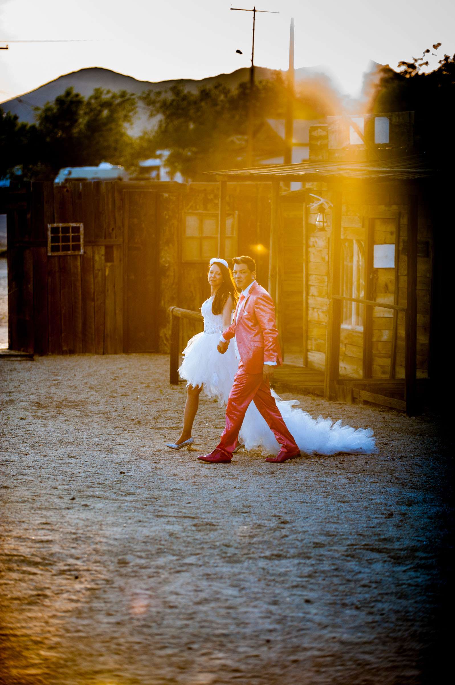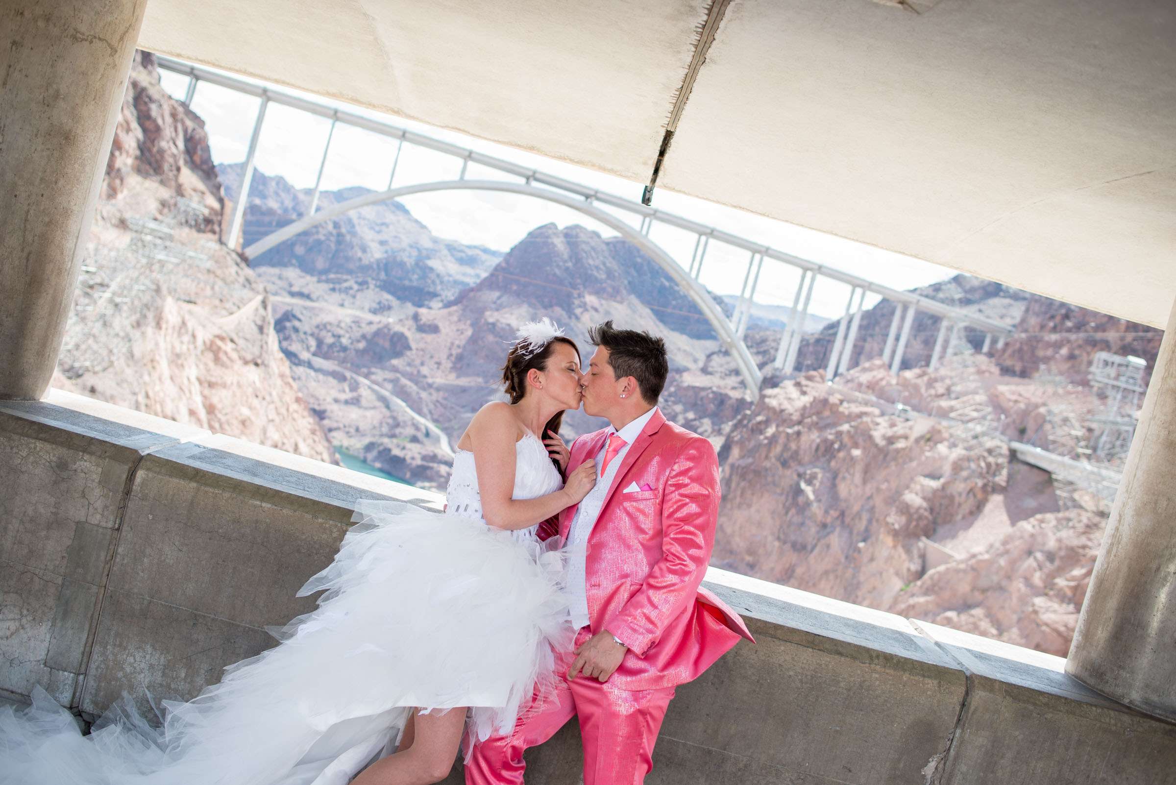 • Hochzeitspaare posieren vor Las Vegas Schild nachts.