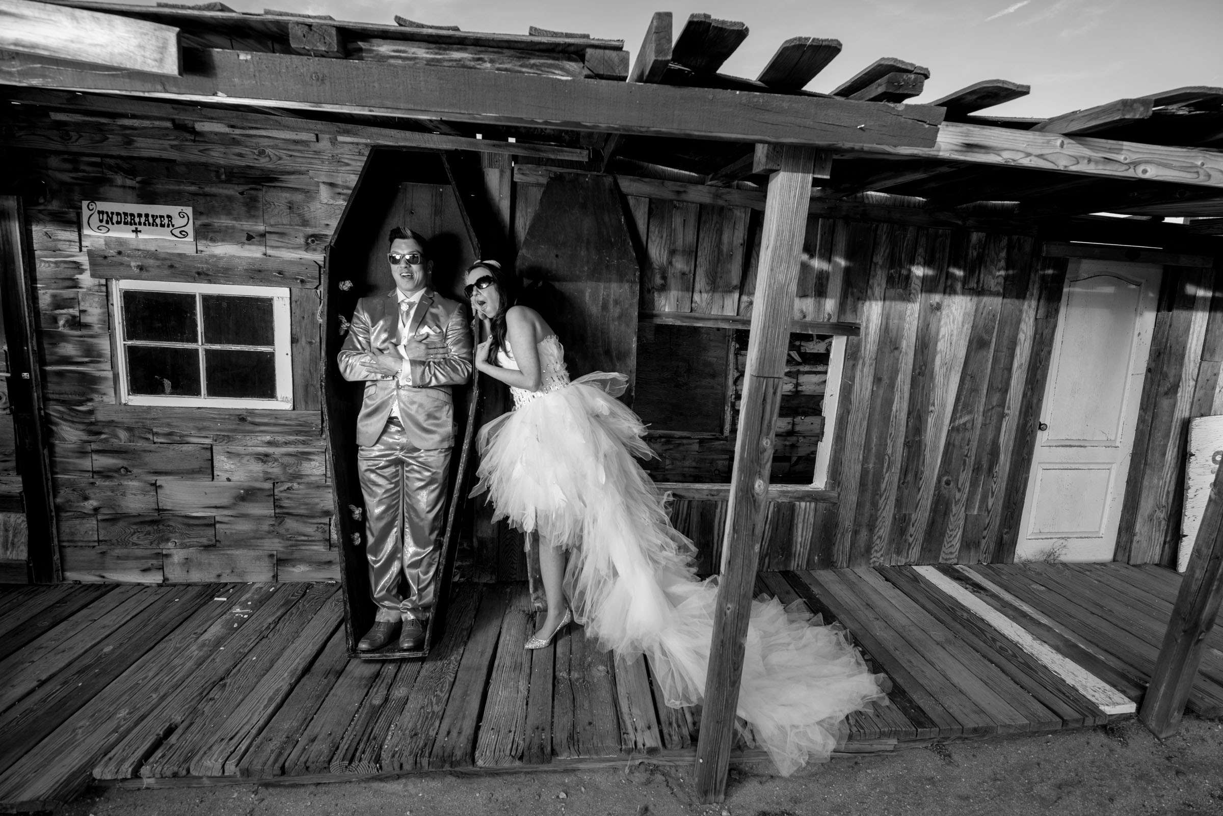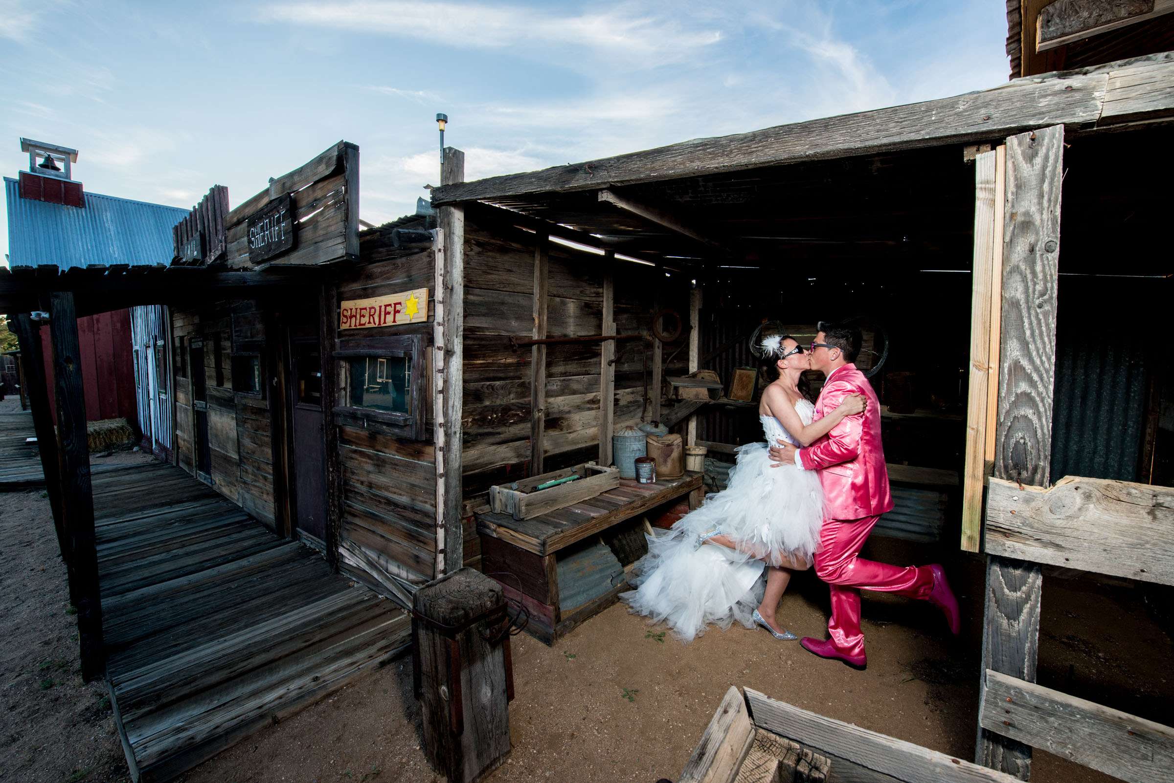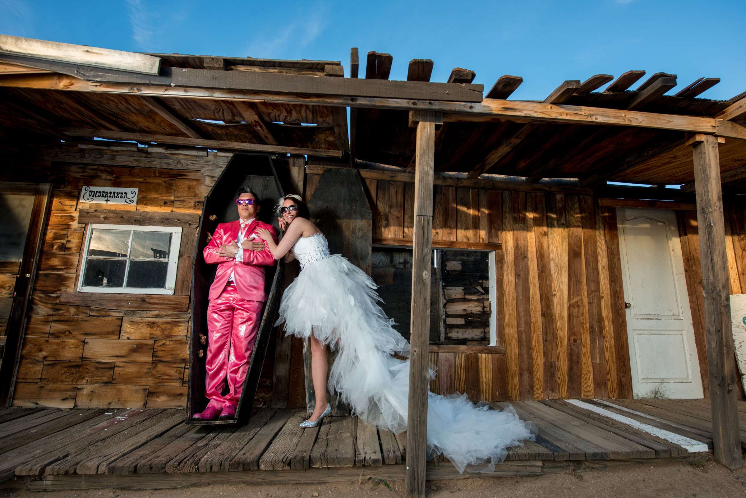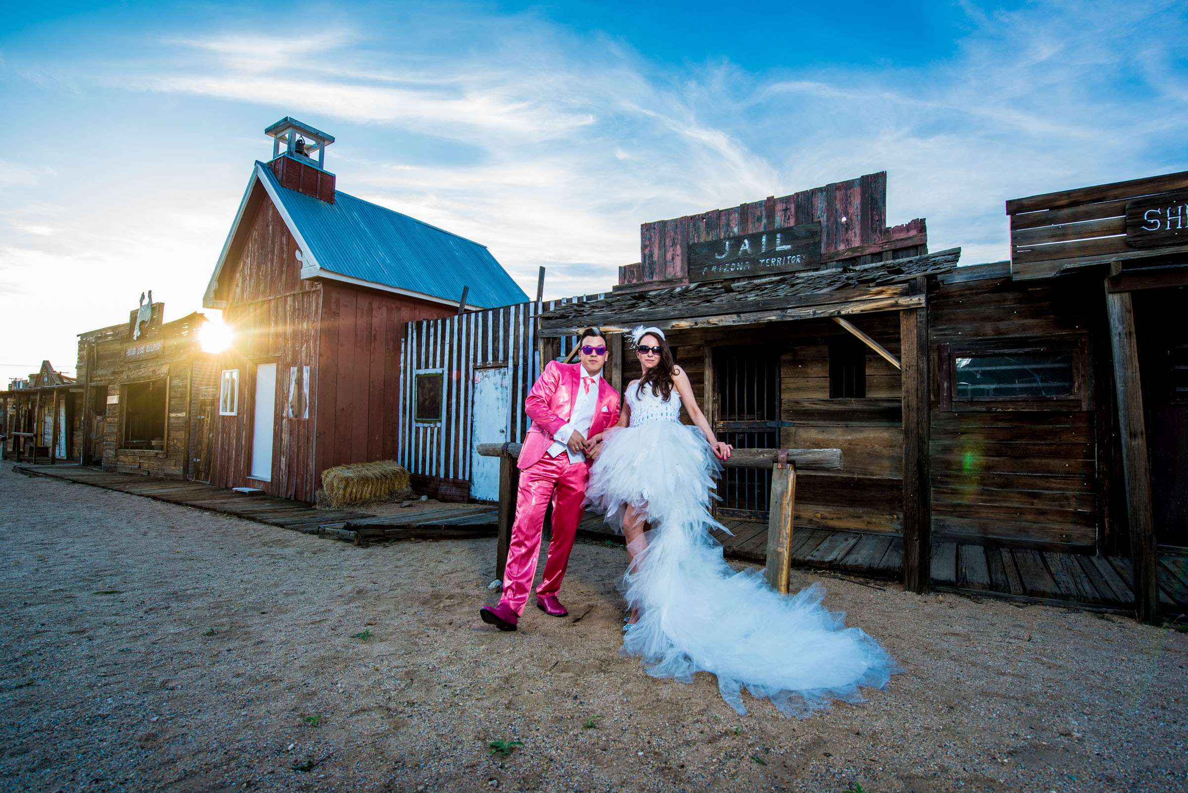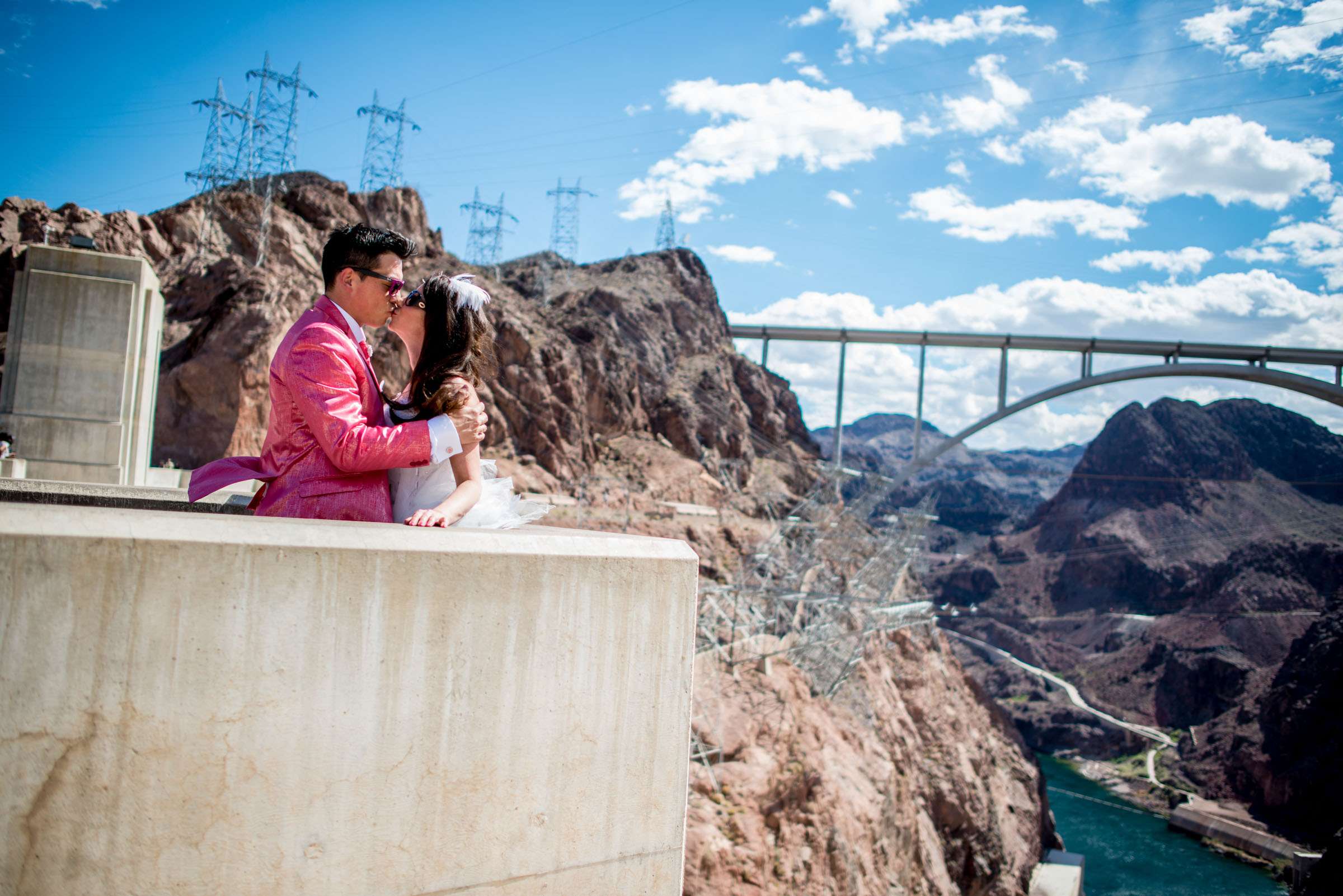 • Hochzeitspaare posieren vor Las Vegas Schild nachts.