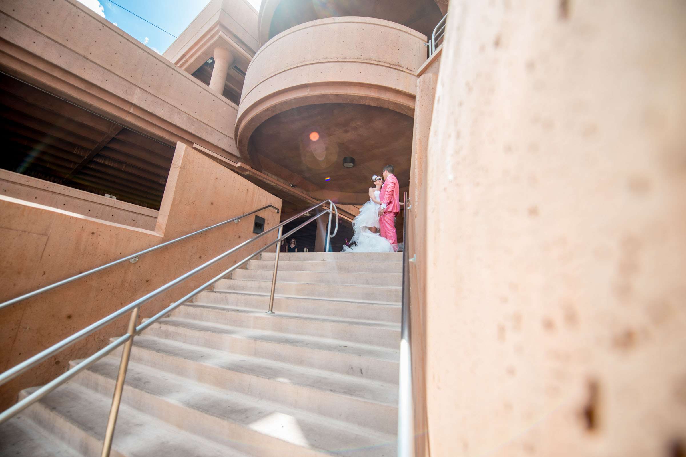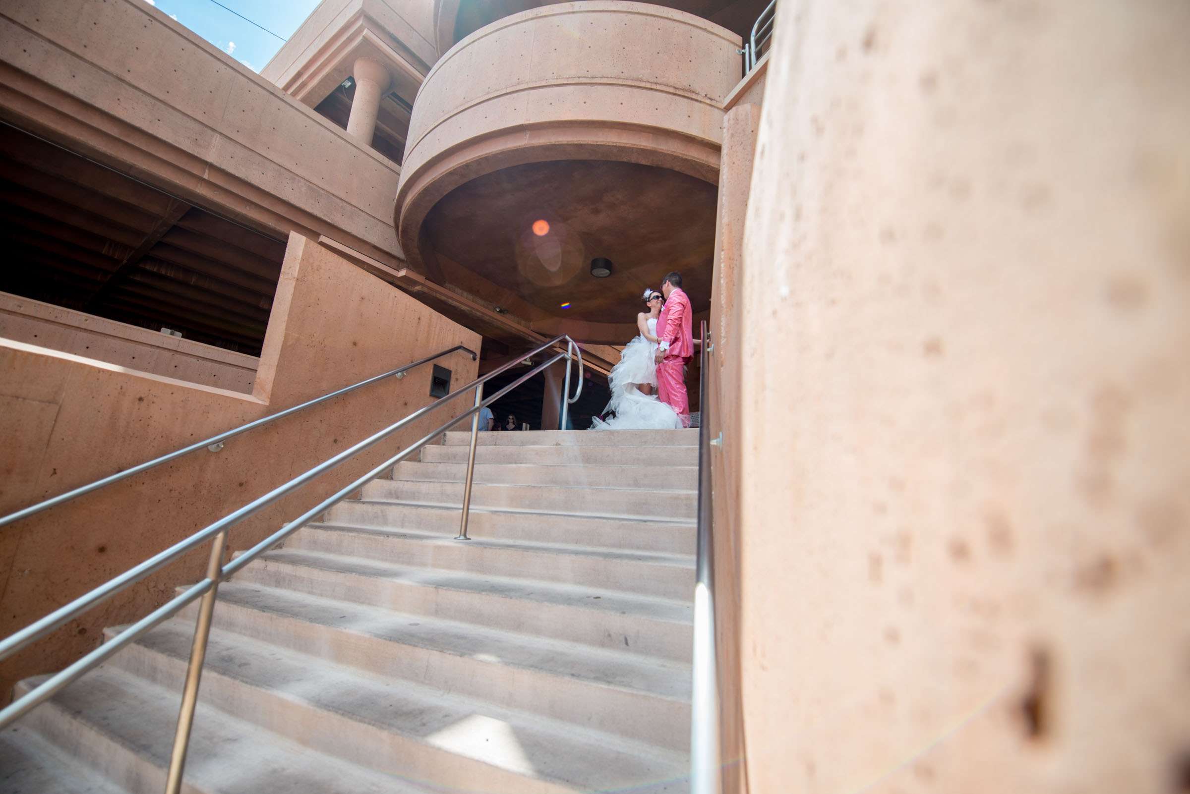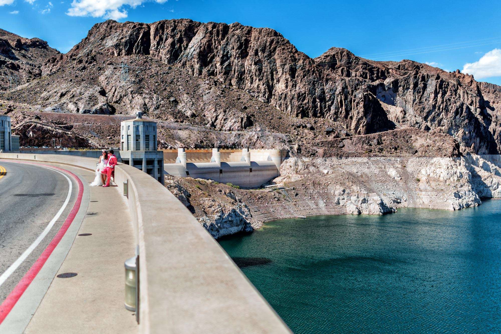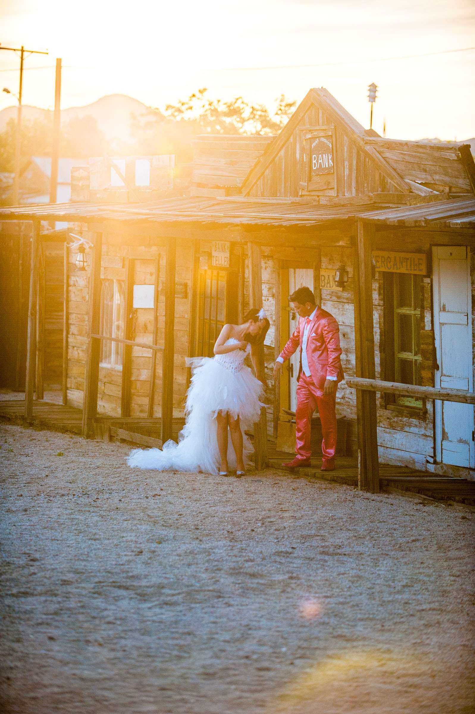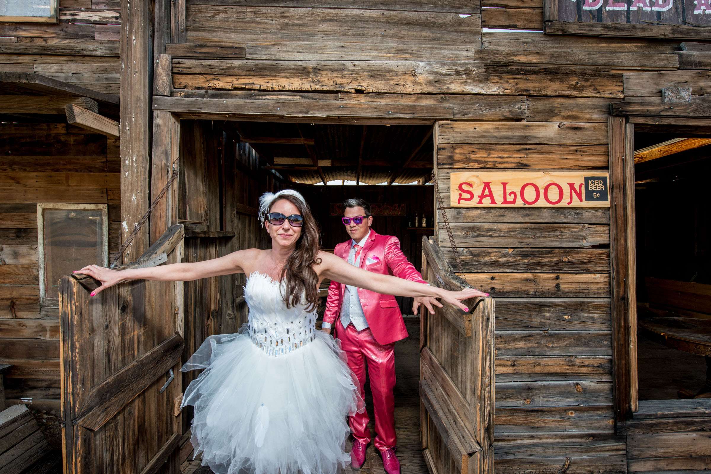 • Hochzeitspaare posieren vor Las Vegas Schild nachts.
