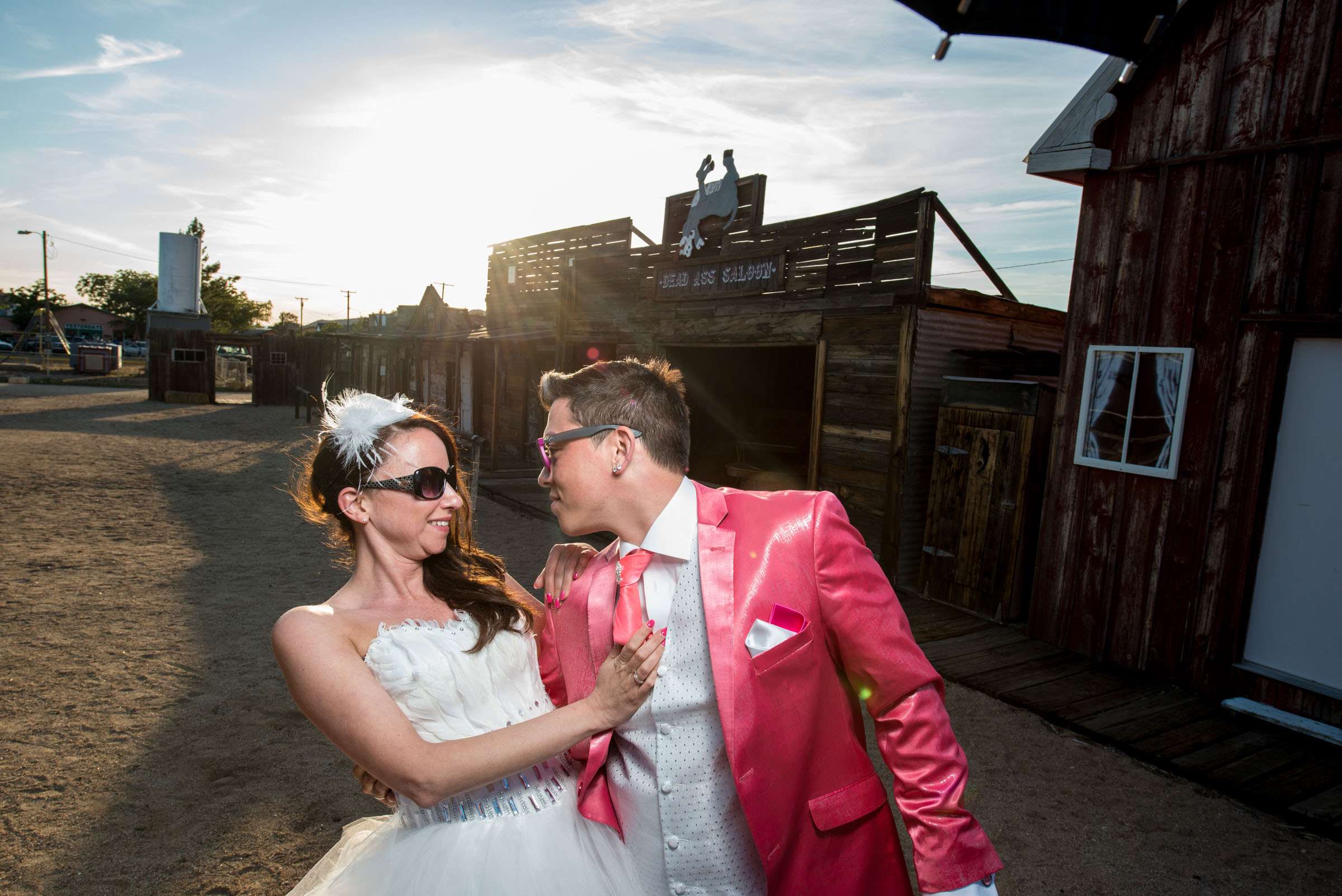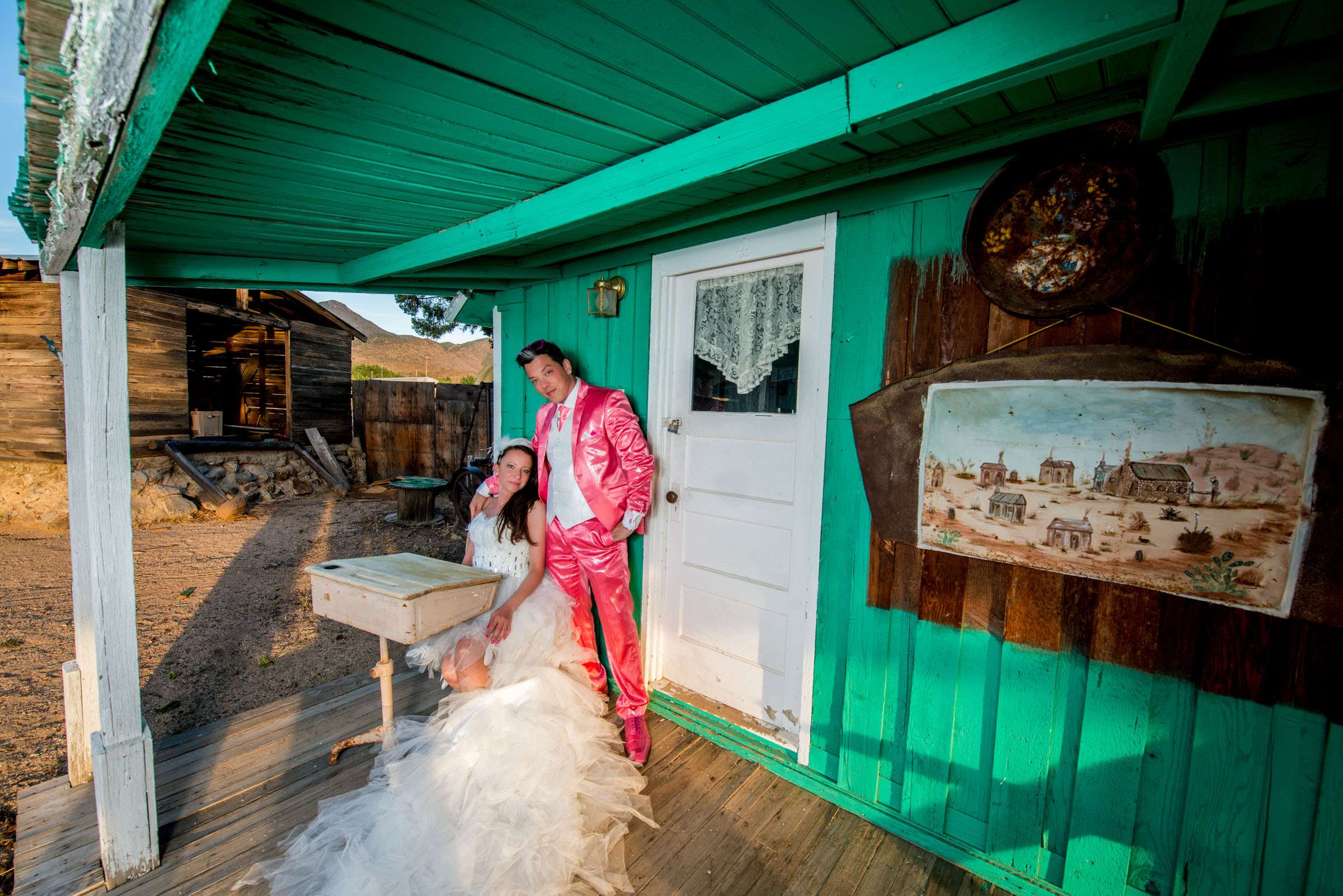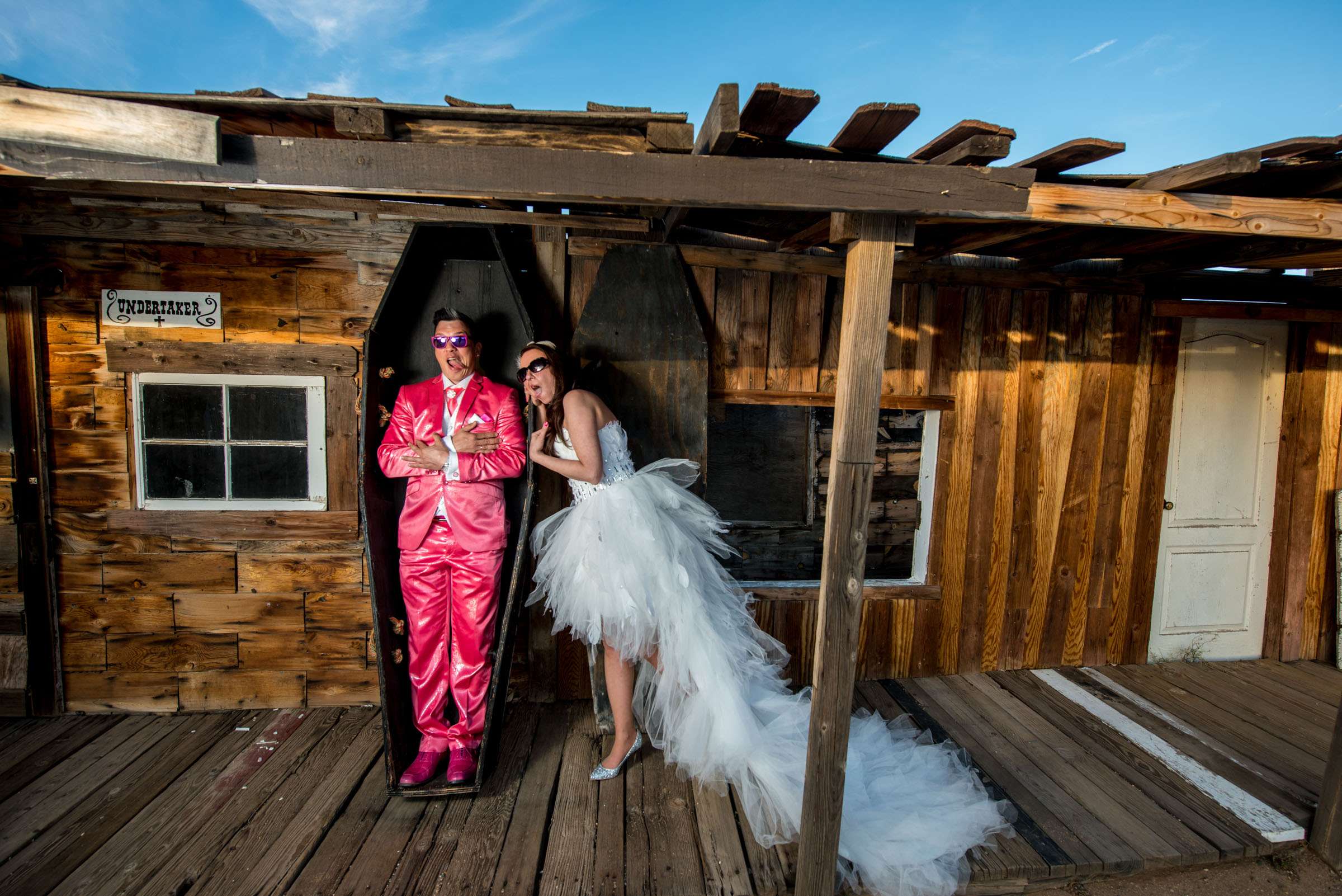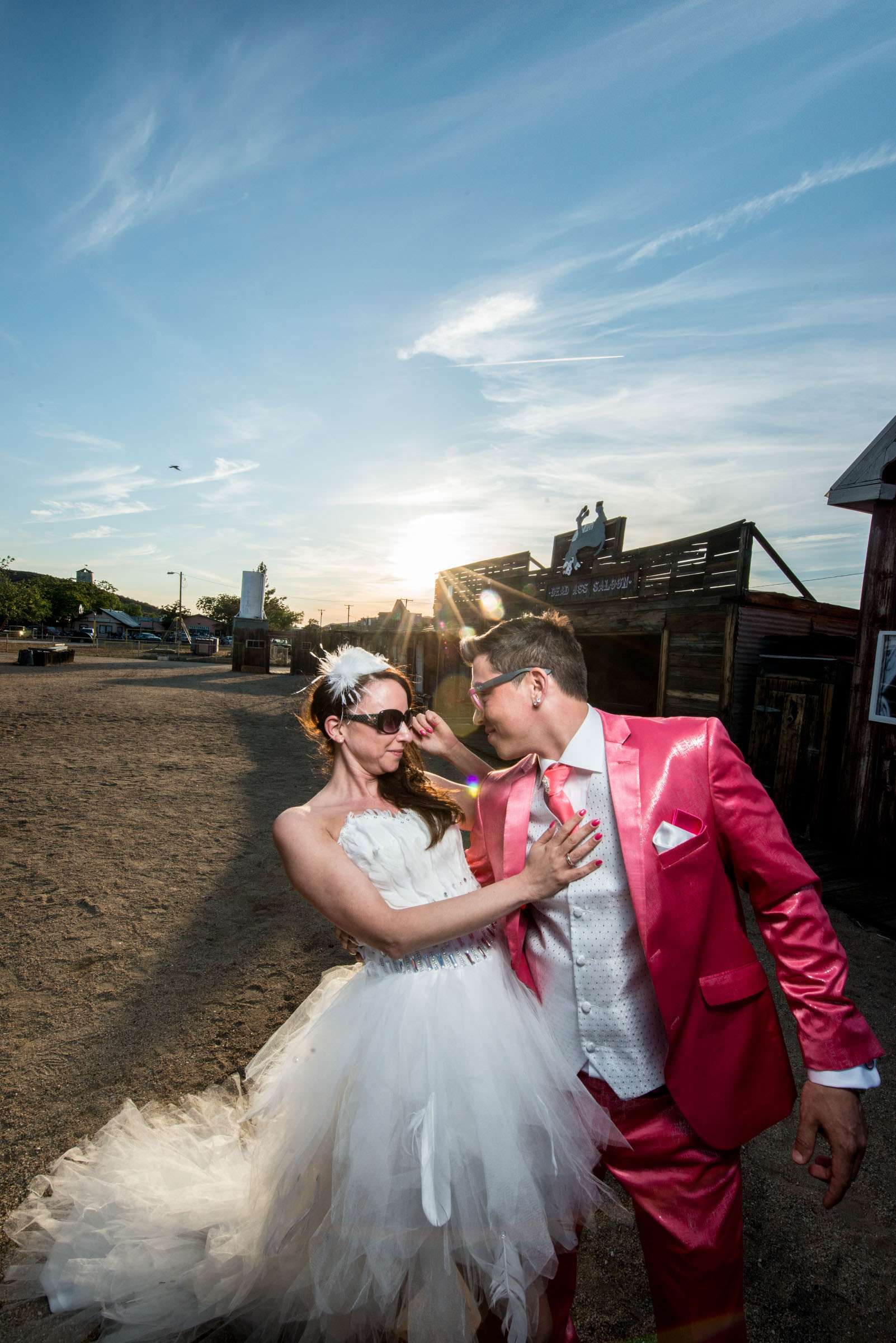 Hochzeitspaare posieren vor Las Vegas Schild nachts.