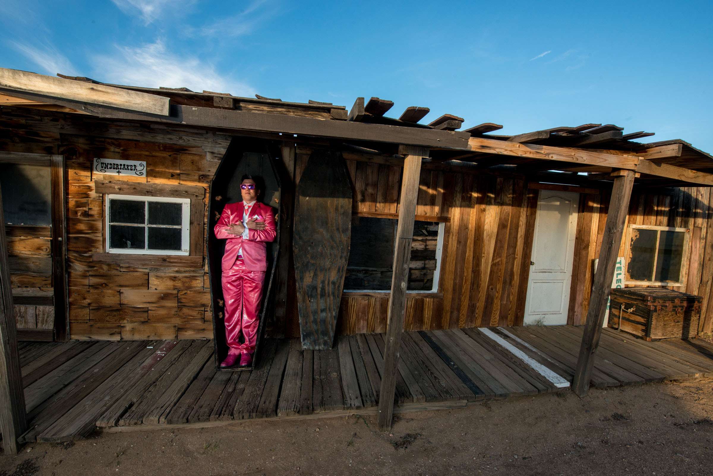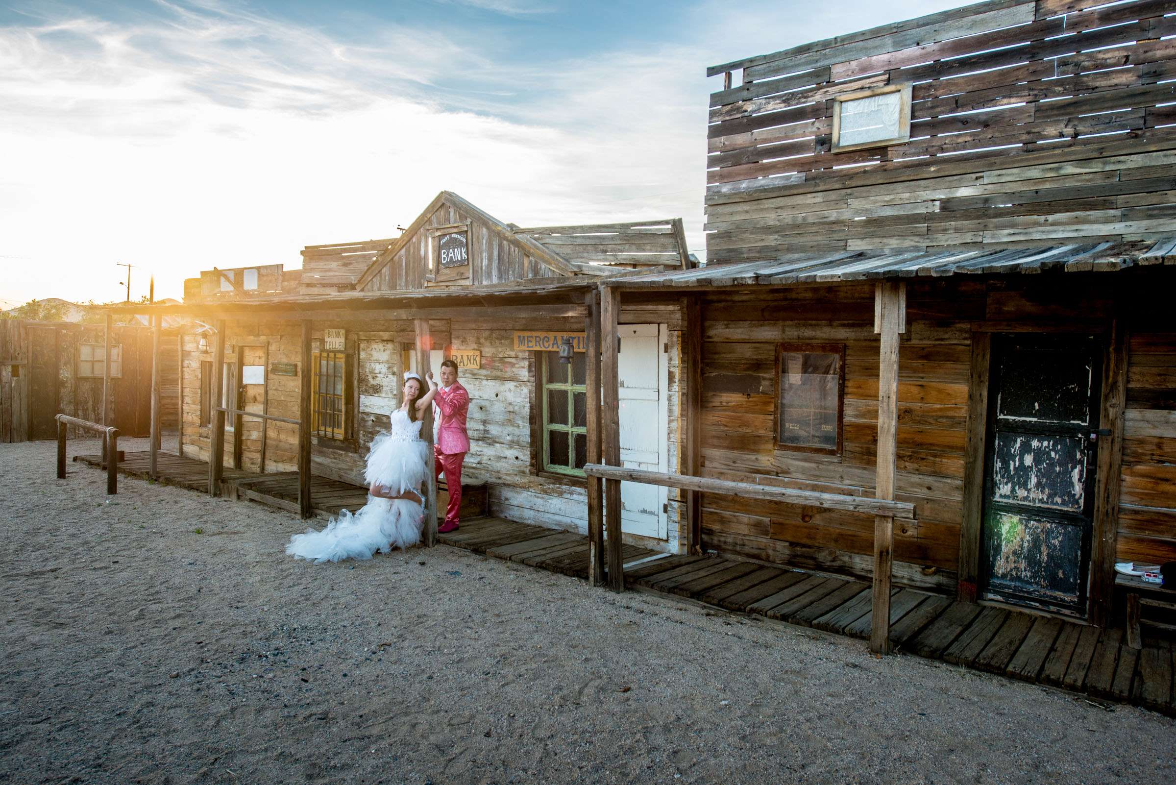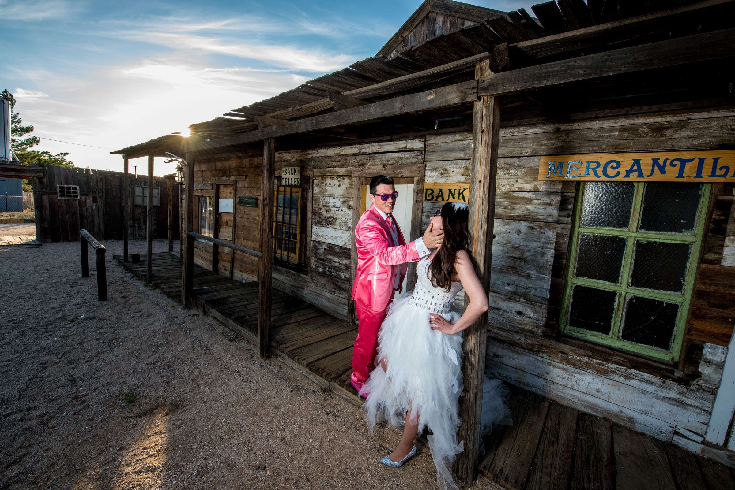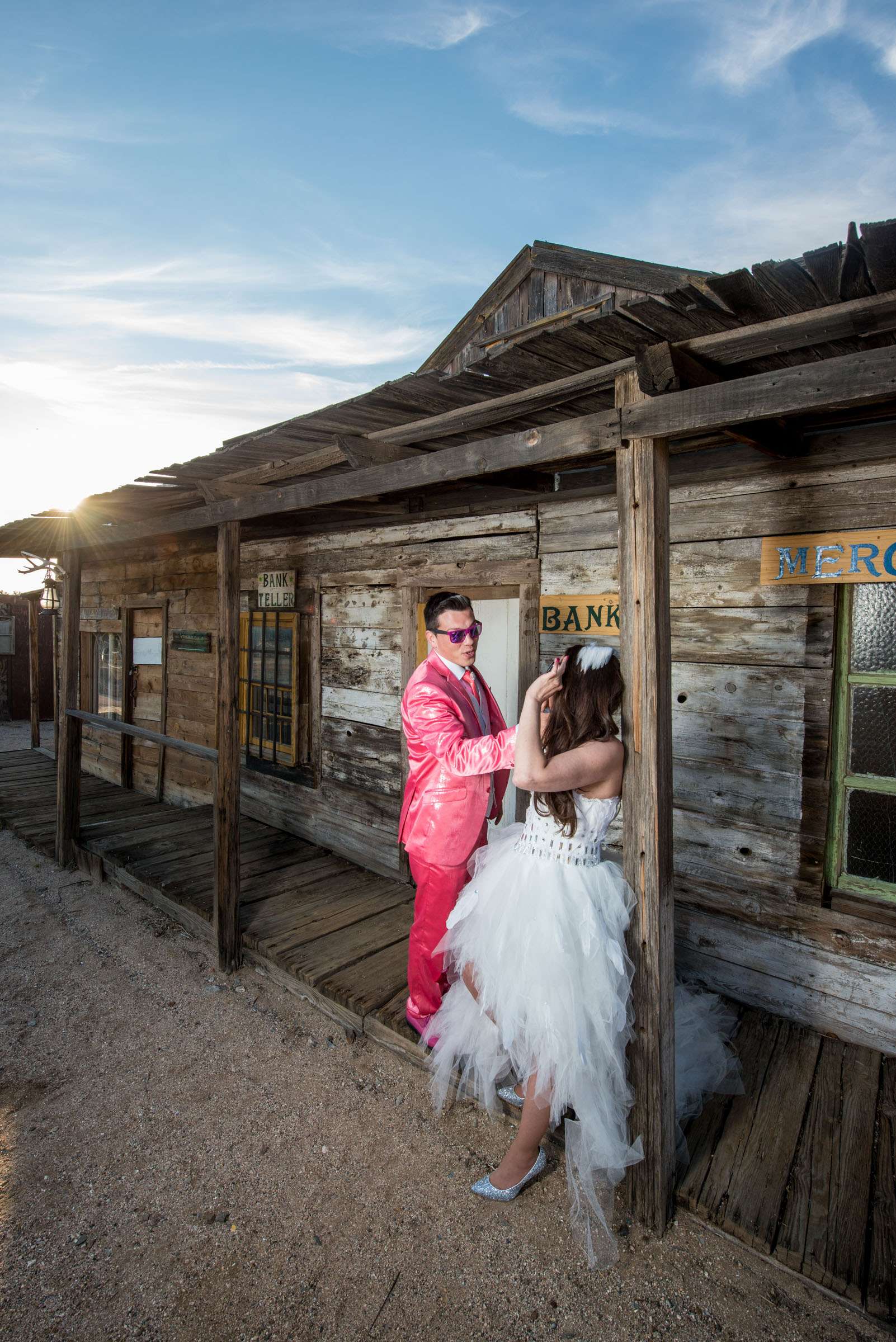 Hochzeitspaare posieren vor Las Vegas Schild nachts.